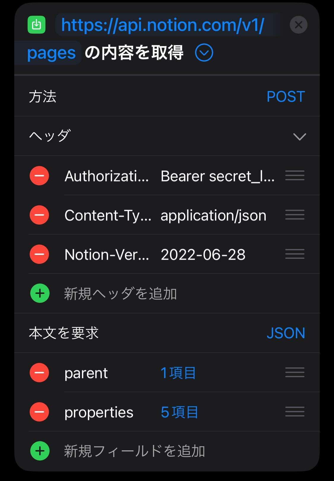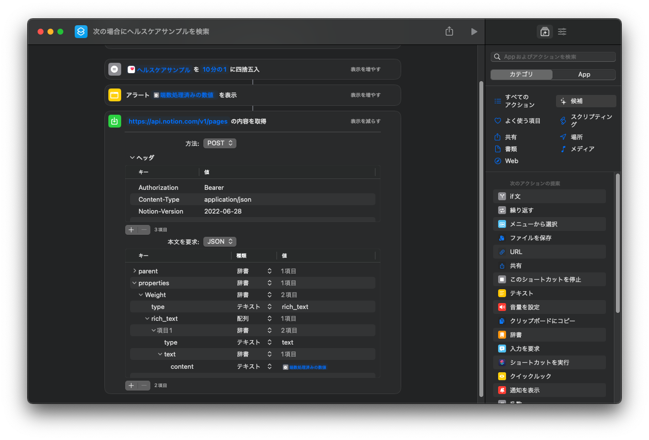 取りたい値が変数化できたらあとはAPIを叩くだけである。ショートカット にはcurlのような機能があるので、それでヘッダーとメソッド指定して、指定したJSONを投げることができる。便利。