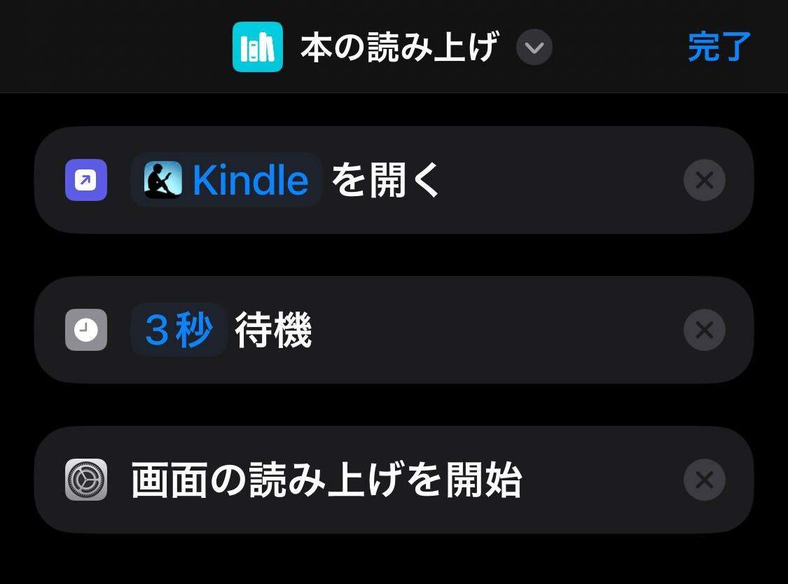 単純にKindleを開いて、3秒待機して(待機しないと読み上げ機能に至らないことが頻発したので)、読み上げ機能をオンにするだけのショートカットだ。