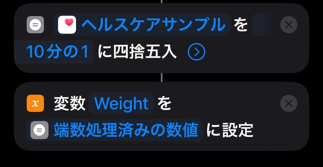 あと、残念ながら ショートカット のデータをまとめて取得するというのができないので、体重以外にBMIとか筋肉量とか色々取れるのだけど、上記のような変数を取りたい値だけ設定する必要があるし、全部iPhoneでやるので滅茶苦茶面倒。