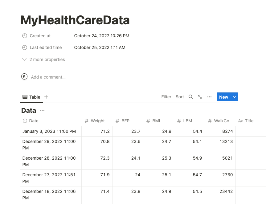 私は結局、体重、BFP(体脂肪率)、BMI、LBM(体脂肪を除いた体重)と歩数だけにした。