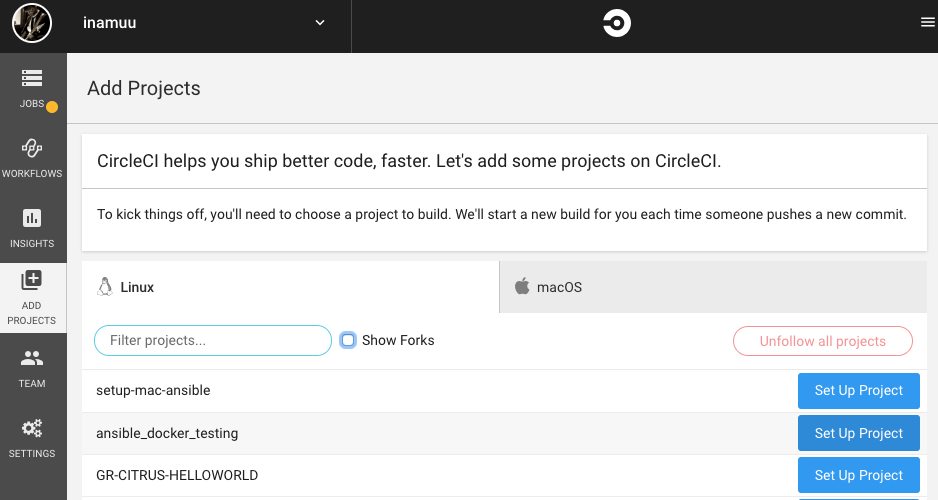 まず、CircleCIと連携する必要があるので、CircleCIへログインする。その時にGithubと連携させればすぐにリポジトリが表示される。そのまま対象リポジトリの「set up project」を選択する。