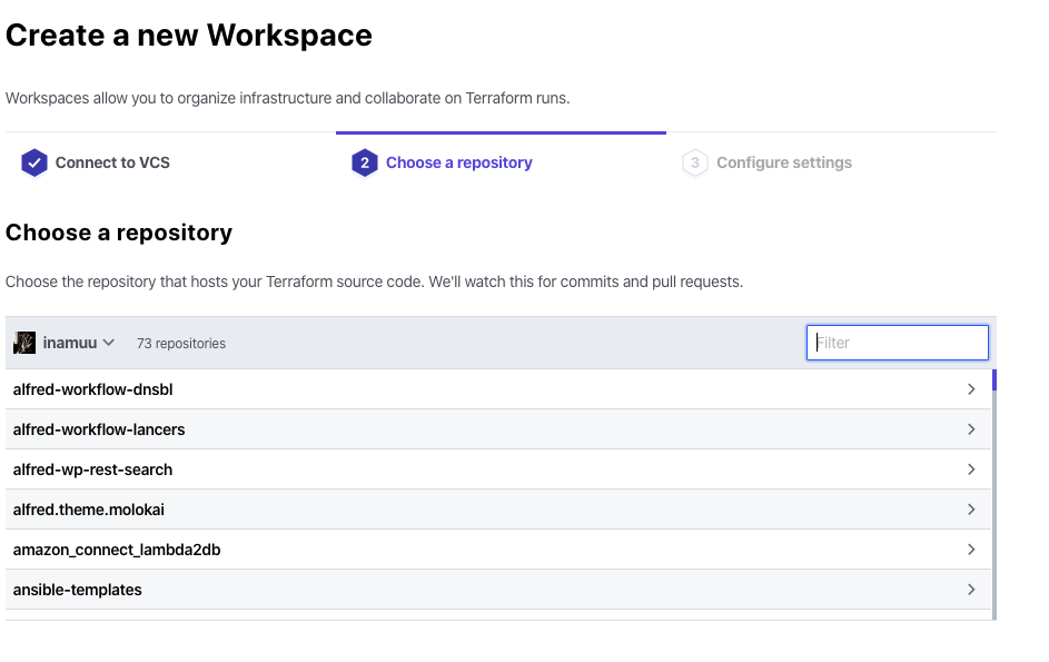 GitHubでTerraformを管理するリポジトリを作成し、TerraformCloudでWorkspaceを作成します。
