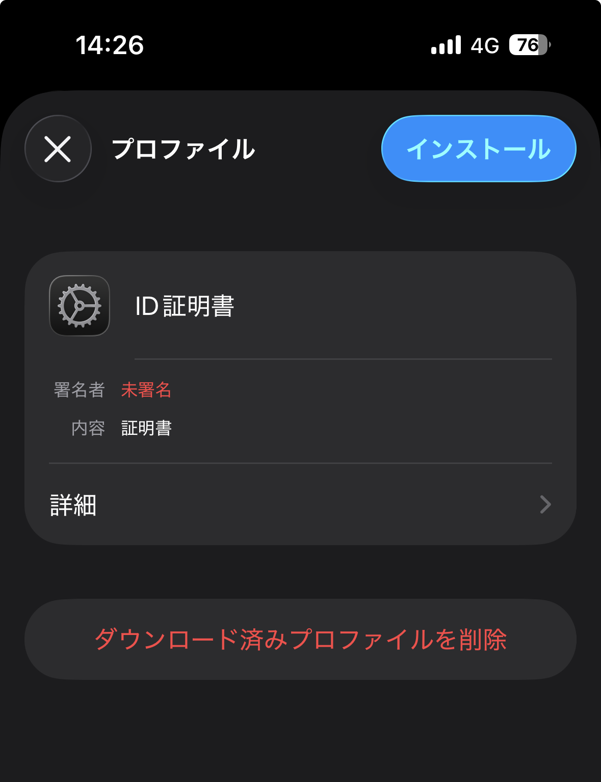 プロファイルとしてダウンロードされるので、それをインストールする。