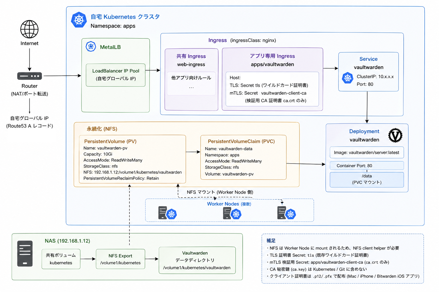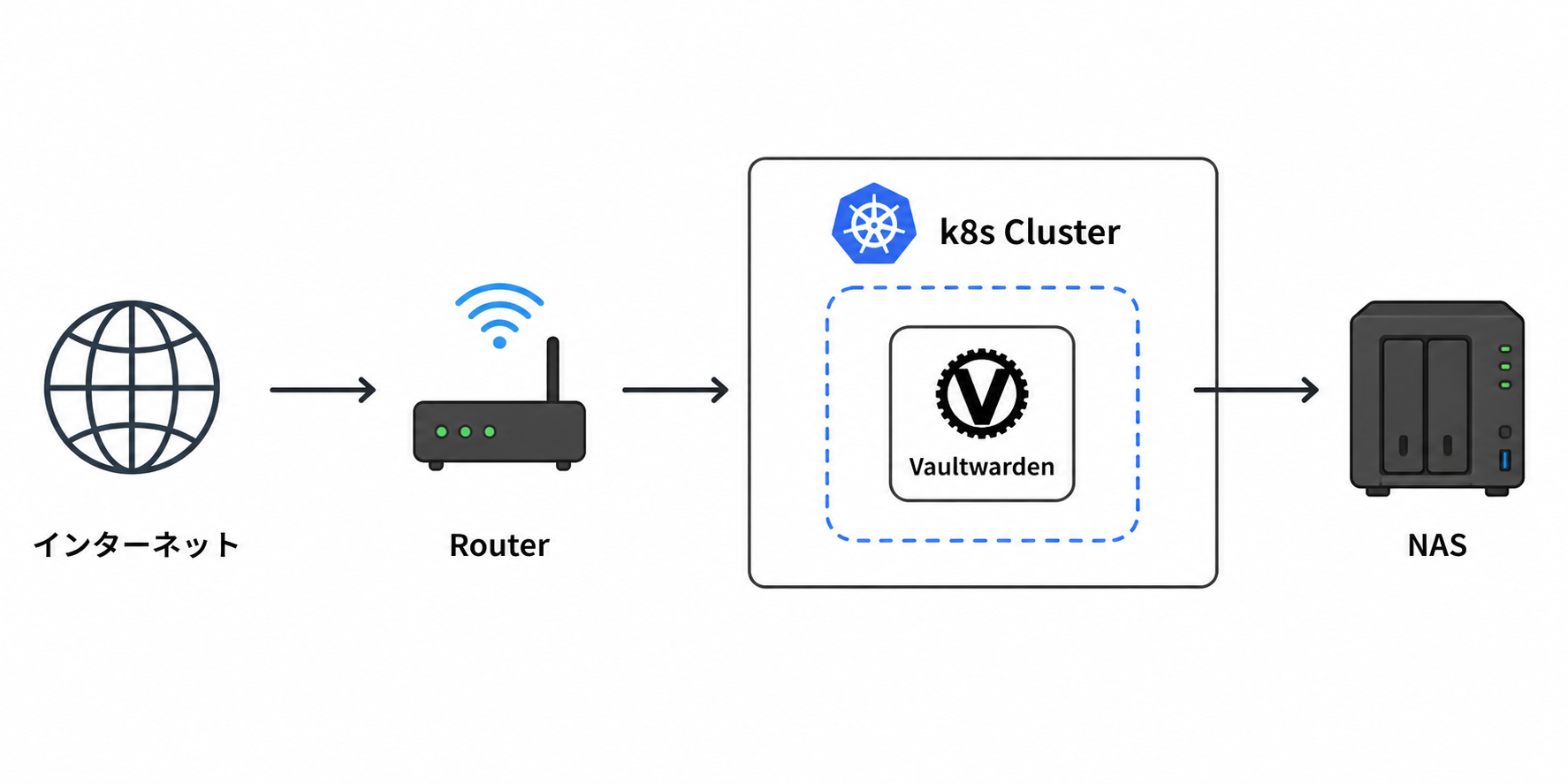 Vaultwardenの構築とは関係ないk8s周りでErrorになった所とか、NASでNFSマウントのサービス有効化がどこか迷ったりしたものの、比較的スムーズに構築することができた。