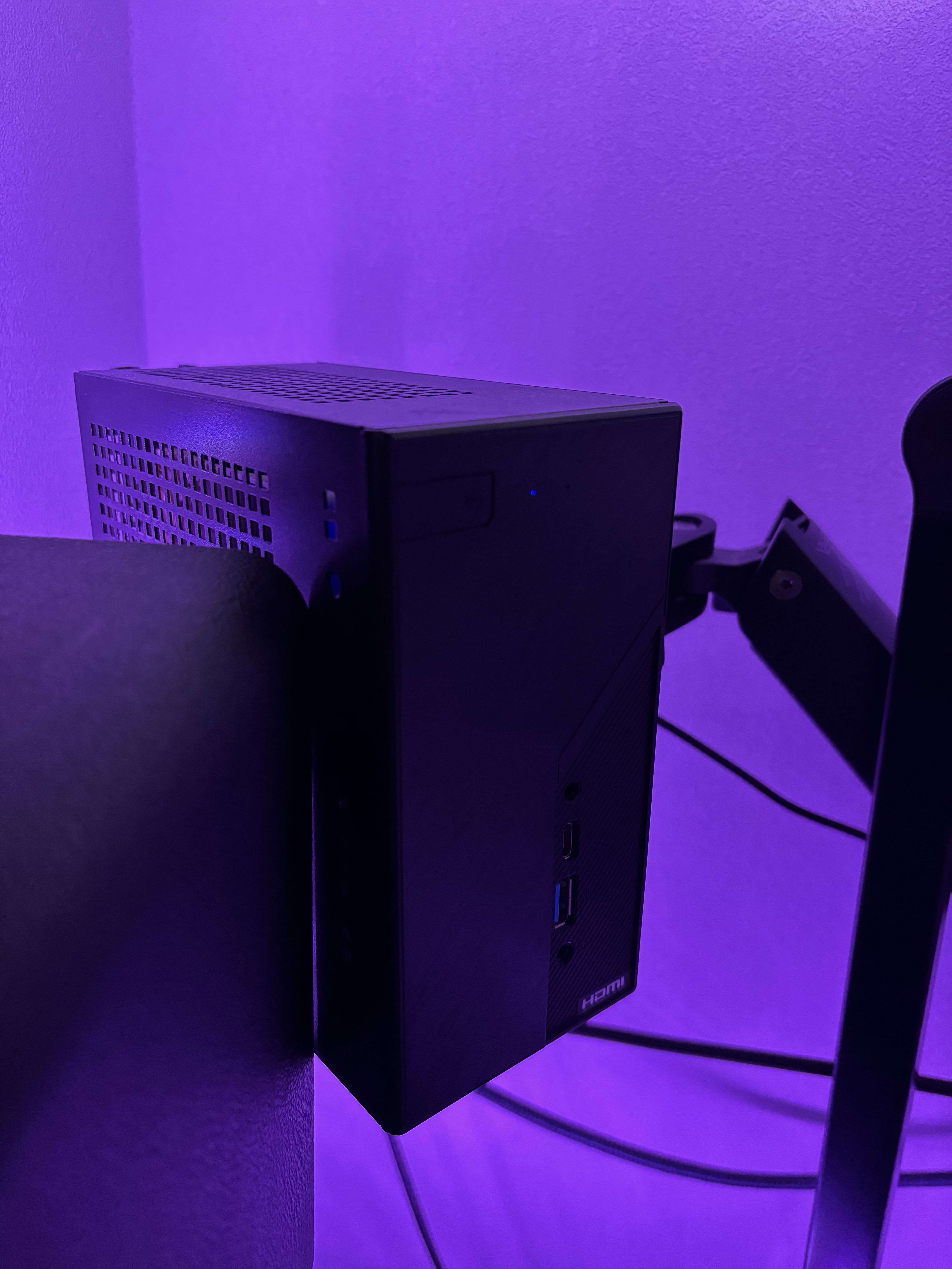 ASROCK Deskmini X300というベアボーンキットで動き、余ったVESAマウントでマウントして空中に浮かせている。