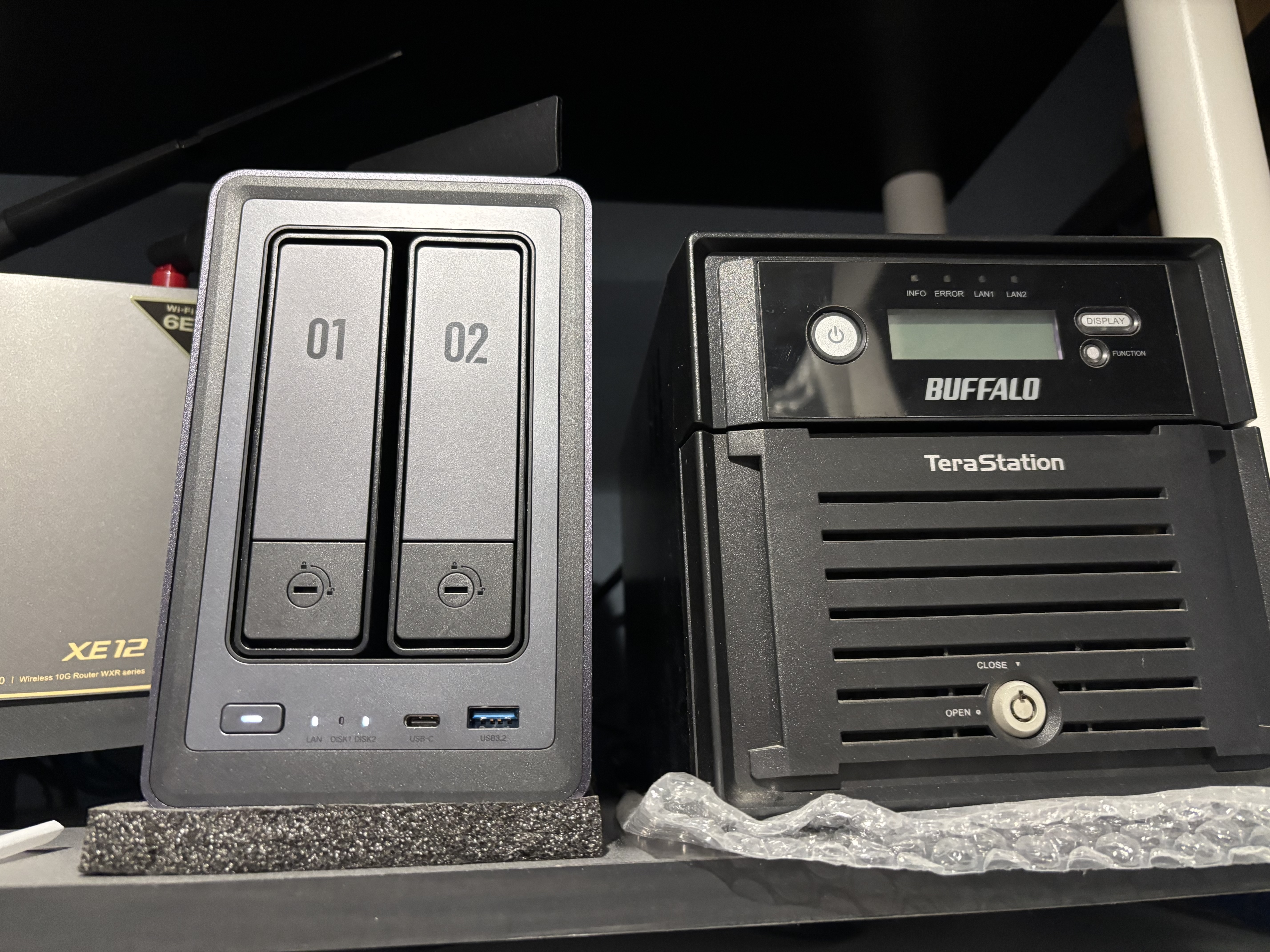 右が10年くらい動かしていた旧NAS。2TBx2 RAID1で運用していた。
